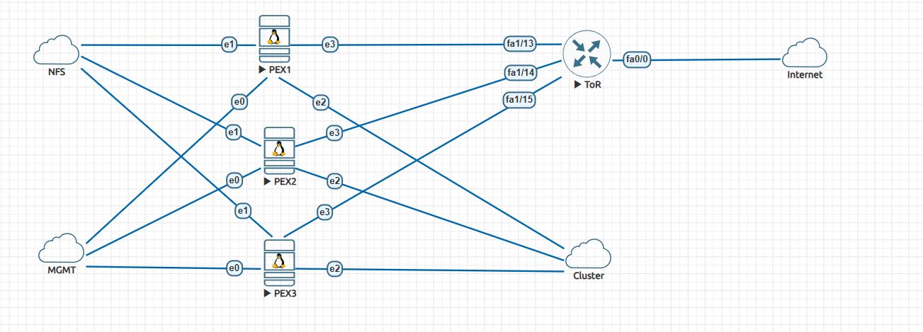 - Three OVS bridges. One for communication to the NFS backend, one for creating the cluster, and finally one for VLANs and for bridging the VLANs.