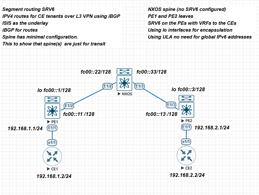 - NXOS is a transit router. We are also using ULA IPv6 addresses for the data plane. Of course you could use global addresses but remember global addresses are routable on the Internet. Thus in a production environment you need to have your firewall prevent access (you use an IPv6 firewall in your network don’t you!).